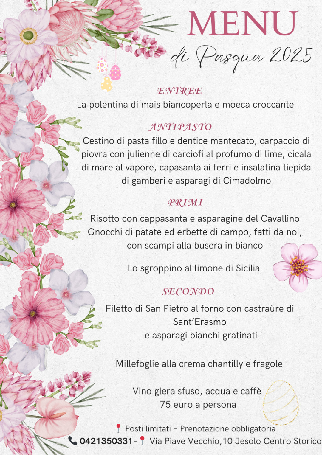 Situato nel centro storico di Jesolo, gode di un’atmosfera raffinata e accogliente. La felice ubicazione e l’ottima cucina sono gli ingredienti essenziali del suo successo. Ha raggiunto la fama attuale con una rapida progressione dal 1996, grazie all’esperienza della famiglia Baccega, non nuova a successi nella ristorazione, con la fortunata gestione quindicennale del Tre Leoni fino al ’95.